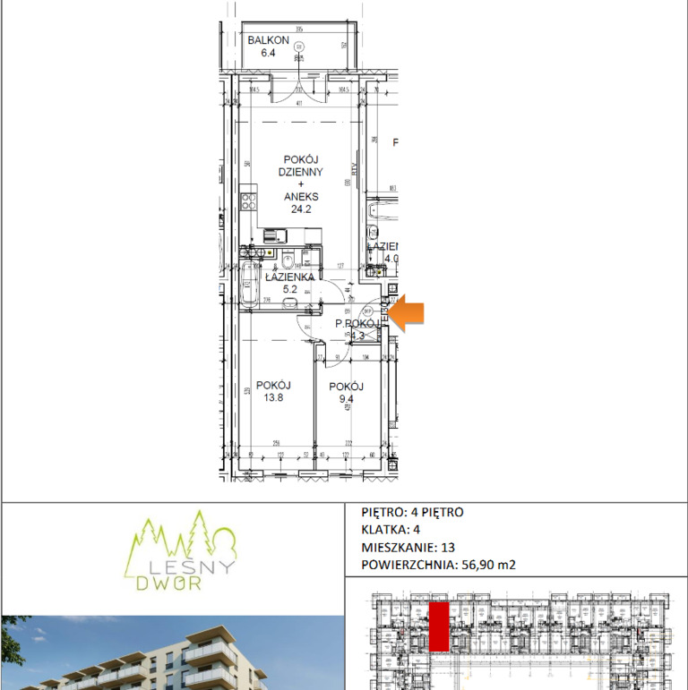 Składa się ono z: salonu z aneksem kuchennym, 2 sypialni, łazienki, przedpokoju oraz dużego balkonu.