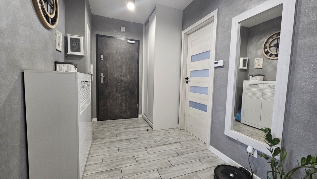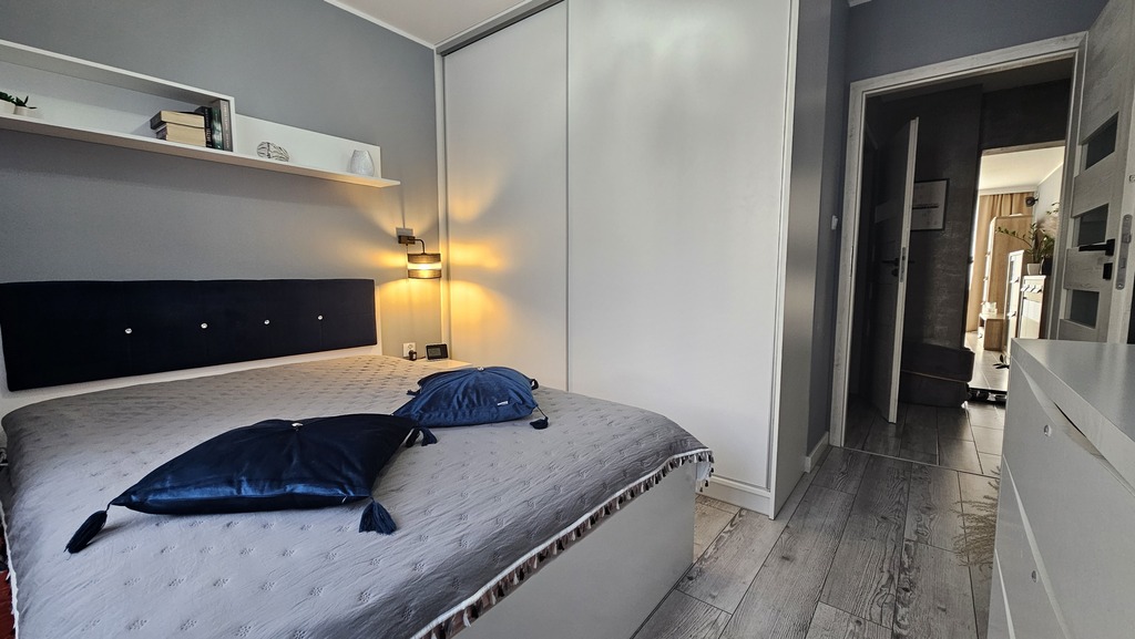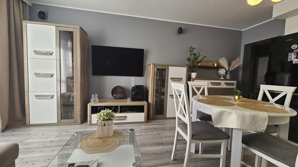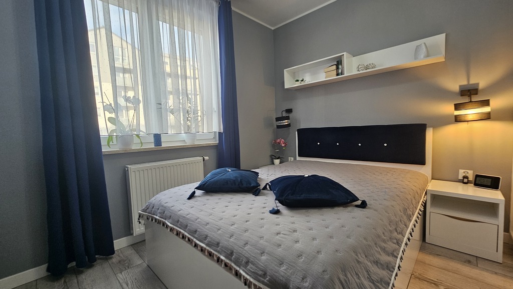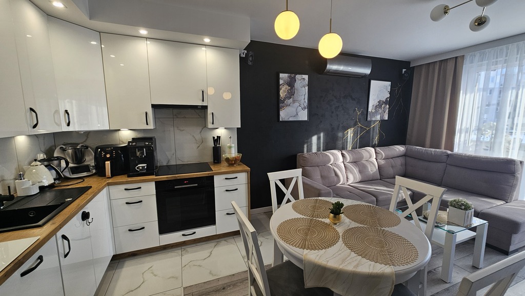 Kuchnia i salon~Nowoczesna kuchnia wykonana pod wymiar w pełni wyposażona w sprzęt AGD wysokiej klasy: płyta, piekarnik i zmywarka45 Bosch, lodówka Samsung.~W salonie pozostaje wysokiej klasy kino domowe oraz klimatyzacja. Meble do uzgodnienia z właścicielem.~Sypialnia~W sypialni pozostaje całe umeblowanie z wyjątkiem tv i kina domowego.~Pokój~W pokoju zostają meble robione pod wymiar, w tym pojemna szafa w zabudowie.~Dodatkowe atuty~Piwnica przynależna do mieszkania 2,79m2 ~Dostęp do suszarni oraz rowerowo-wózkowni.~Pięknie zaaranżowany i oświetlony Ledami balkon oddzielony od sąsiedztwa zapewniający prywatność.~Dodatkowe wyciszenie i wygłuszenie ścian pomiędzy blokami, co znacząco podnosi komfort akustyczny.